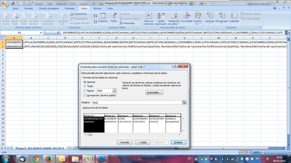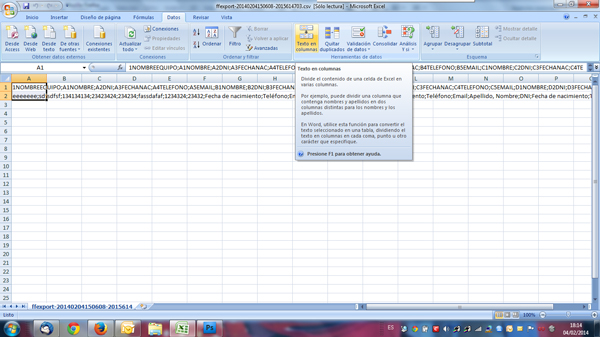 - En el menú de Excel seleccionaremos "Datos" y luego "Texto en columnas".