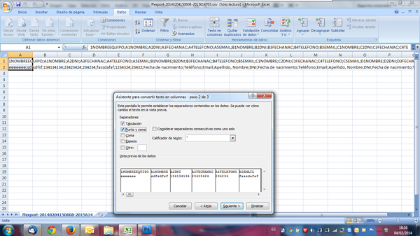 - En el próximo paso tildaremos las casillas de "Tabulación" y "Punto y coma" y nos mostrará un adelanto de como se verán los datos en columnas, luego click en "Siguiente"